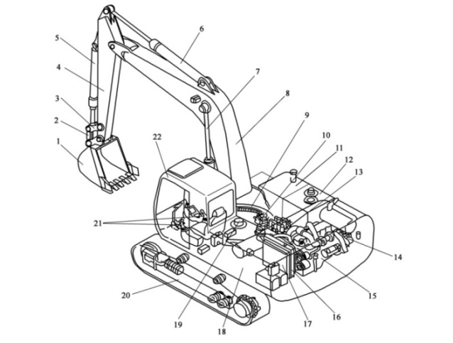 1-鏟斗;2-連桿;3-搖桿;4-斗桿;5-鏟斗油缸;6-斗桿油缸;7-動臂油缸;8-動臂;9-回轉支承;10-回轉驅動裝置;11-燃油箱;12-液壓油箱;13-控制閥;14-液壓泵;15-發動機;16-水箱;17-液壓油冷卻器;18-平臺;19-中央回轉接頭;20-行走裝置;21-操作系統;22-駕駛室