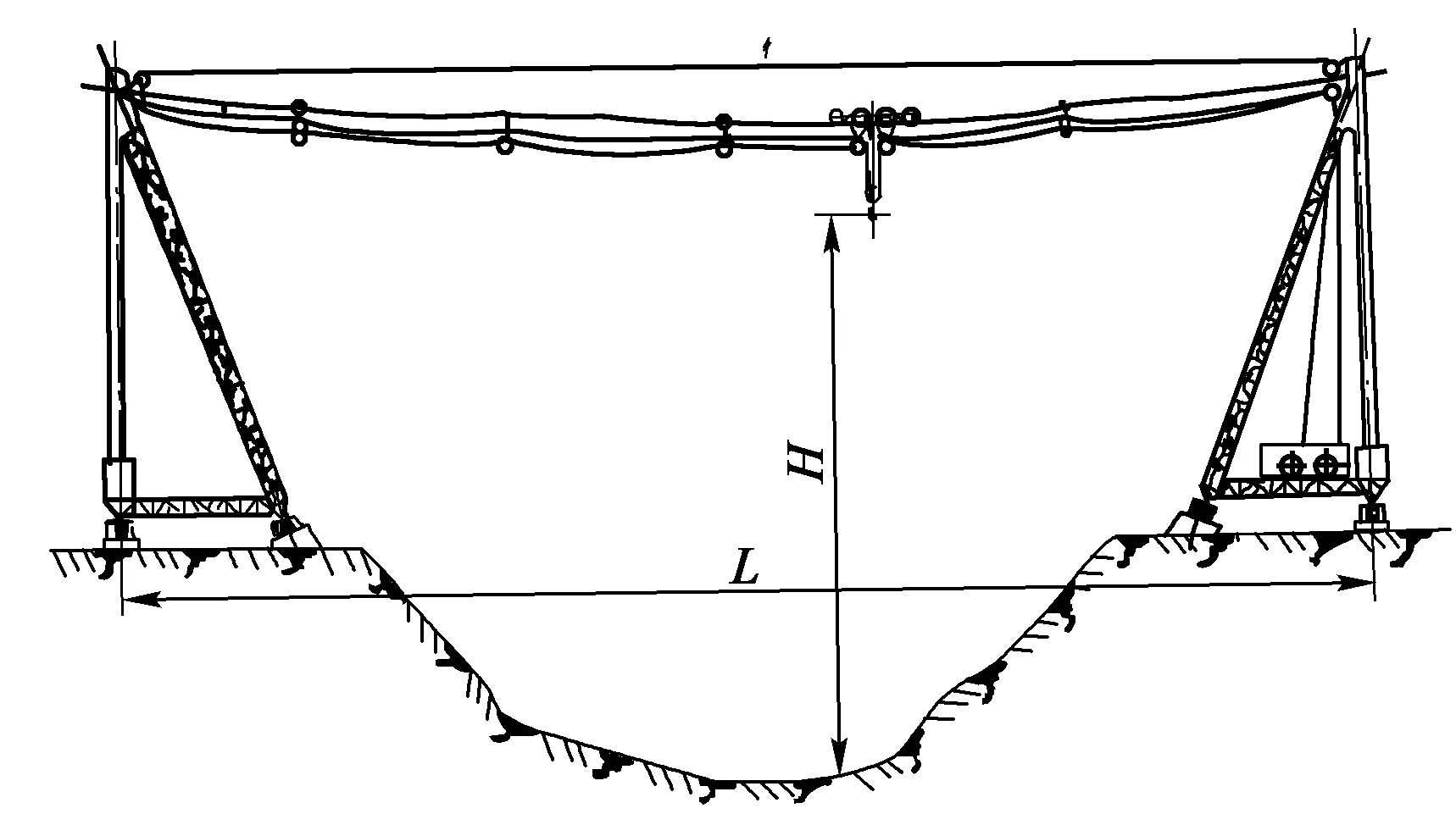 纜索型起重機如(3-5所示。構造特點是取物裝置的起重小車沿著架空的承載鋼絲繩索運行。承載索的兩端分別固定在主、副塔架的頂部,塔架固定在地面的基礎上。小車在鋼絲繩索上運行,起升卷筒和運行卷筒安裝在主塔架上,另一側副塔架上裝有調整鋼絲繩索張力的液壓拉伸機。應用在跨度特別大,地勢復雜、起伏不平或各種類型起重機難以駛達的工作場地。如林場、煤廠、江河、山區和水庫等。纜索型起重機一般是為已確定的工地專門制作的,它的結構和工作性能起決定于它所服務工地的輪廓尺寸和工作性質。