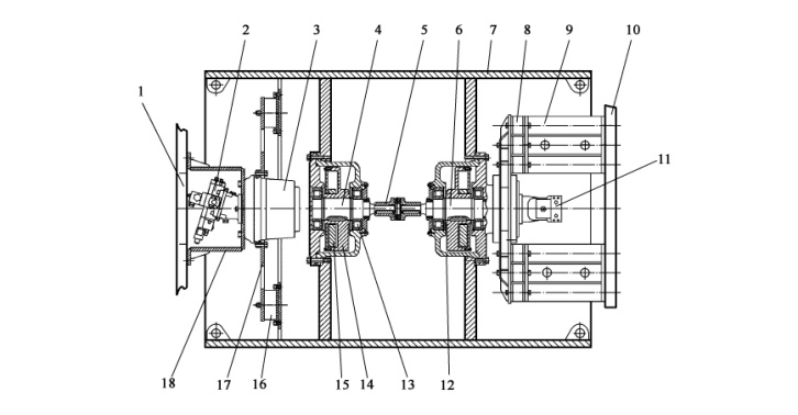 1-前車架左側框板;2-行走馬達;3-行走減速器;4-左振動軸;5-聯軸器;6-右振動軸;7-振動輪體;8-減振塊;9-右連接支架; 10-前車架右側框板;11-振動馬達;12-軸承;13-箱體;14-固定偏心輪;15-活動偏心輪;16-減振塊;17-行走減速器固定板; 18-左連接支架