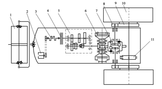 1-導向輪;2-電動機;3-發動機;4-主離合器;5-變速器;6-換向機構;7-差速器;8-側傳動小齒輪;9-側傳動大齒輪;10-驅動輪;11-差速鎖