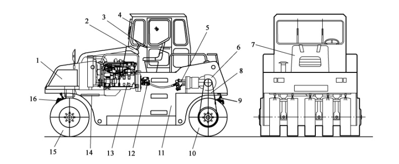 YL26輪胎壓路機由車架11、發動機13、減速器6、后驅動橋7、前輪總成15、后輪總成10、灑水系統9、操作系統3、轉向系統14、液壓系統 5和6、電氣系統 18等組成。