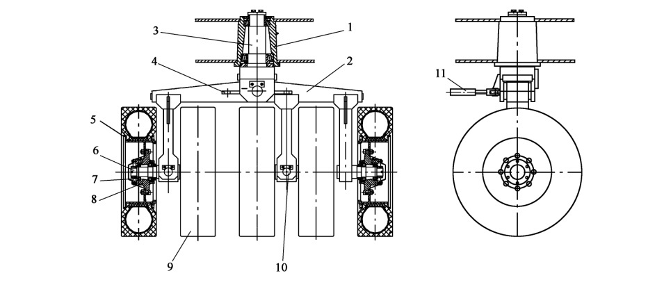 1-車架;2-擺動架;3-轉向立軸;4-擺動軸;5-輪輞;6-擺動輪軸;7-軸承;8-輪轂;9-輪胎;10-軸;11-轉向油缸