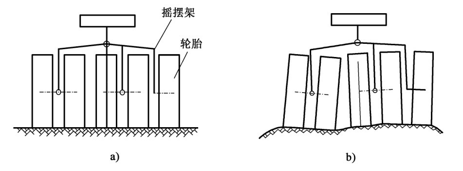 由于輪胎壓路機用多輪胎支承,所以必須用懸掛裝置保證每個輪胎負荷均勻,在不平整的鋪層上還能保持機架的水平。懸掛裝置有液壓懸掛和機械搖擺兩種。YL26輪胎壓路機前輪采用的機械搖擺式懸掛裝置機構簡圖。