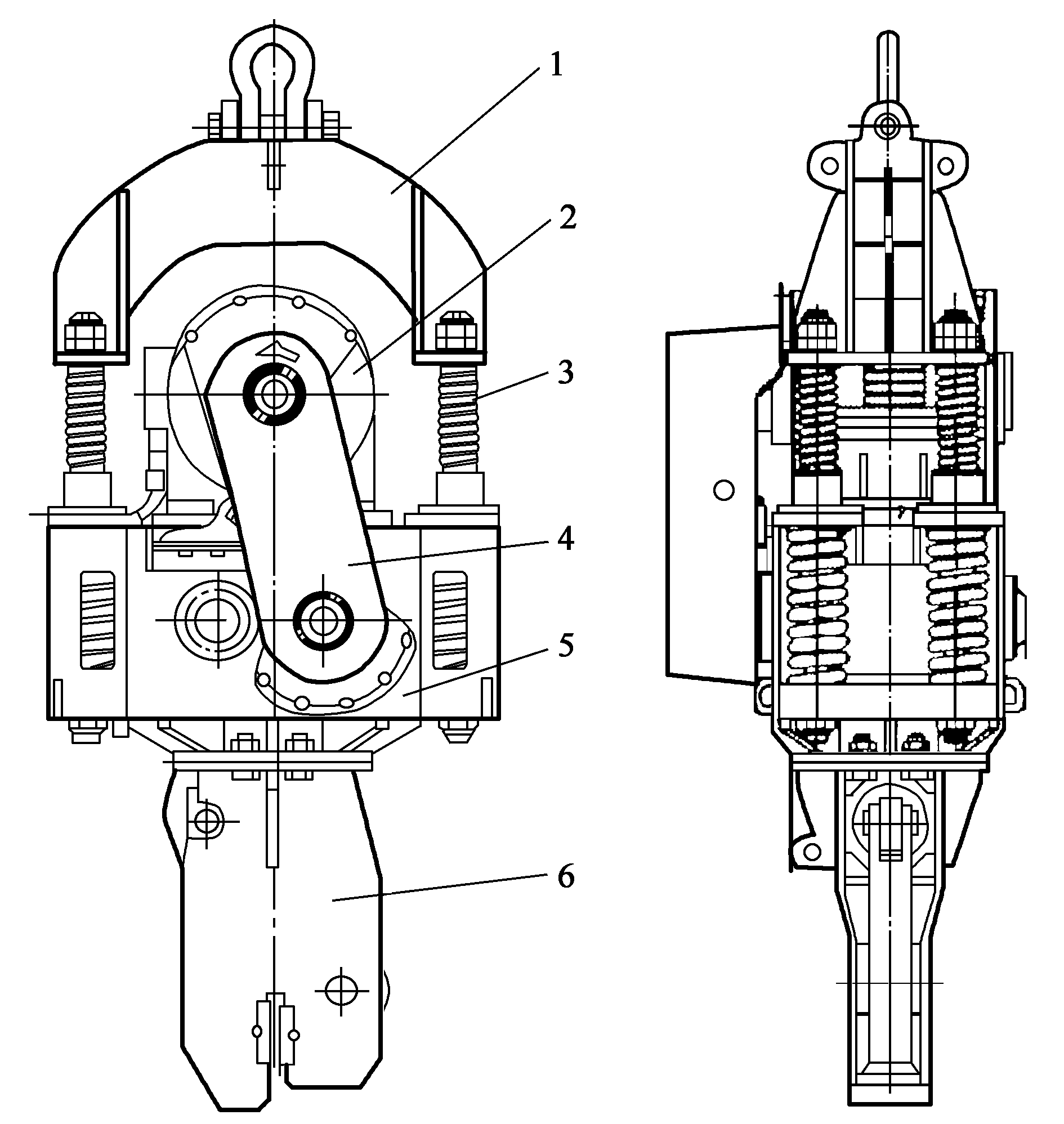 DZ30型振動(dòng)錘,主要由扁擔(dān)梁1、電動(dòng)機(jī)2、減振器3、傳動(dòng)裝置4、激振器5、夾持器6和液壓泵站等組成。