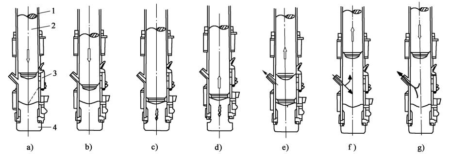 g.掃氣過程:上活塞的動能全部轉化為勢能后,又再次下降,一部分新鮮空氣與殘余廢氣的混合氣由排氣口排出直至重復噴油過程,柴油錘便周而復始地工作。