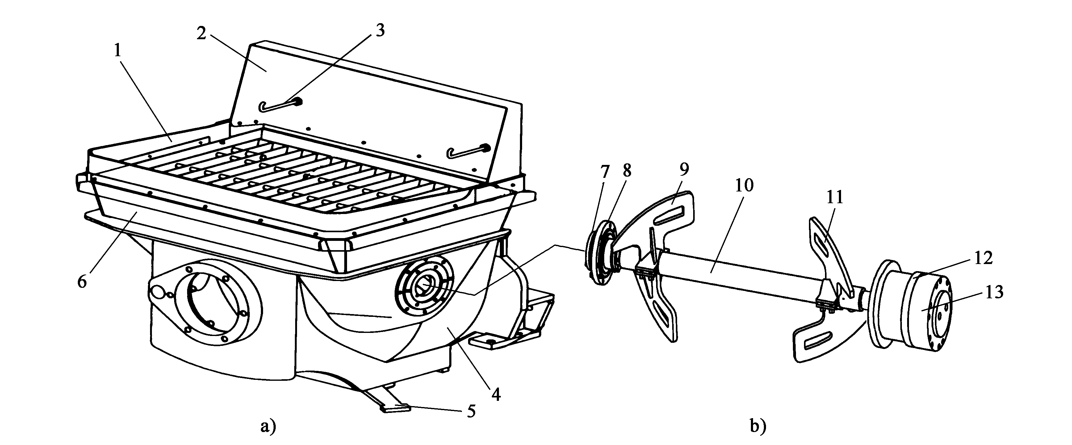 料斗與攪拌系統包括:料斗4,攪拌軸組件9、10、11,傳動裝置13及潤滑裝置等部分組成。