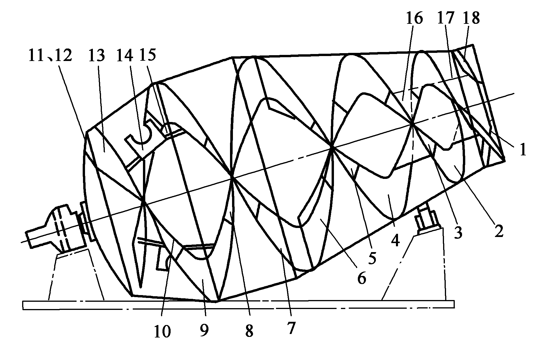 1~13攪拌葉片;14、15輔助葉片;16密封葉片;17進料導管;18筒口葉片
