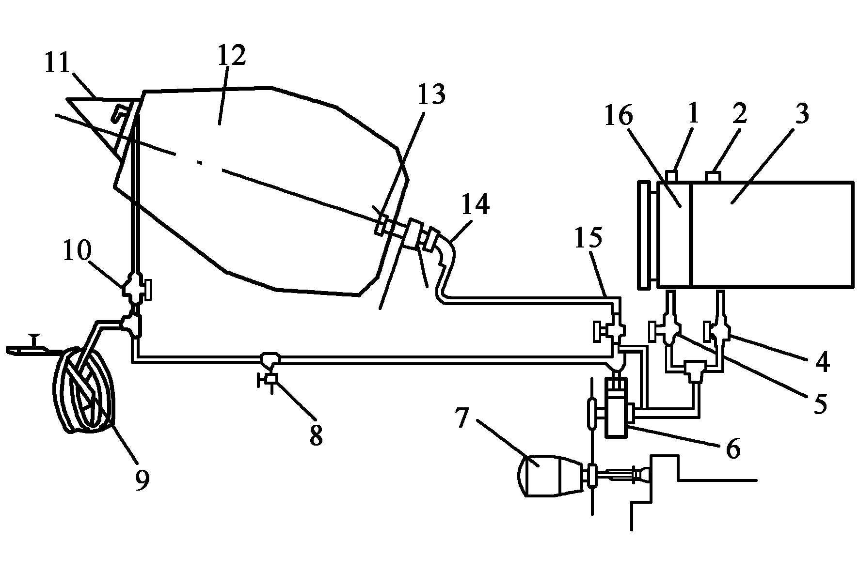 1、2蓋;3攪拌水箱;4A閥;5B閥;6水泵;7發動機;
