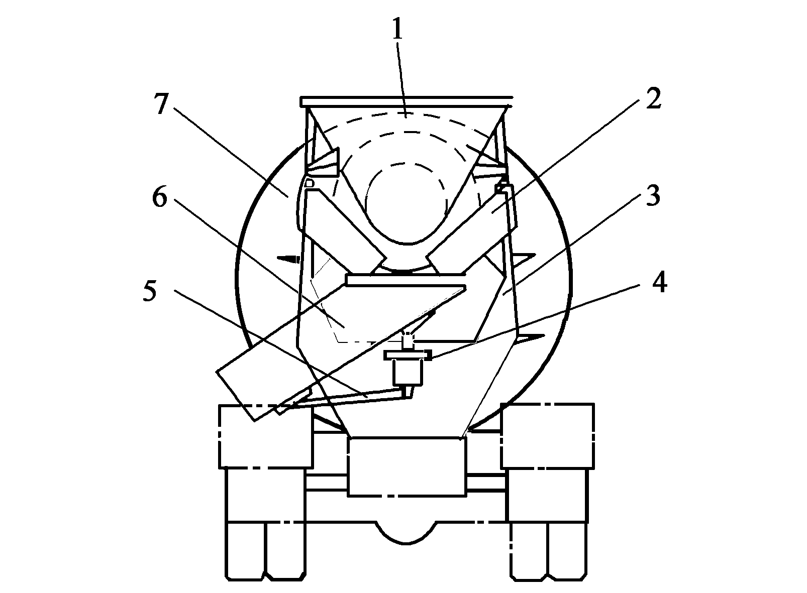 1加料斗;2固定卸料溜槽;3門形支架;4活動溜槽調節轉盤;