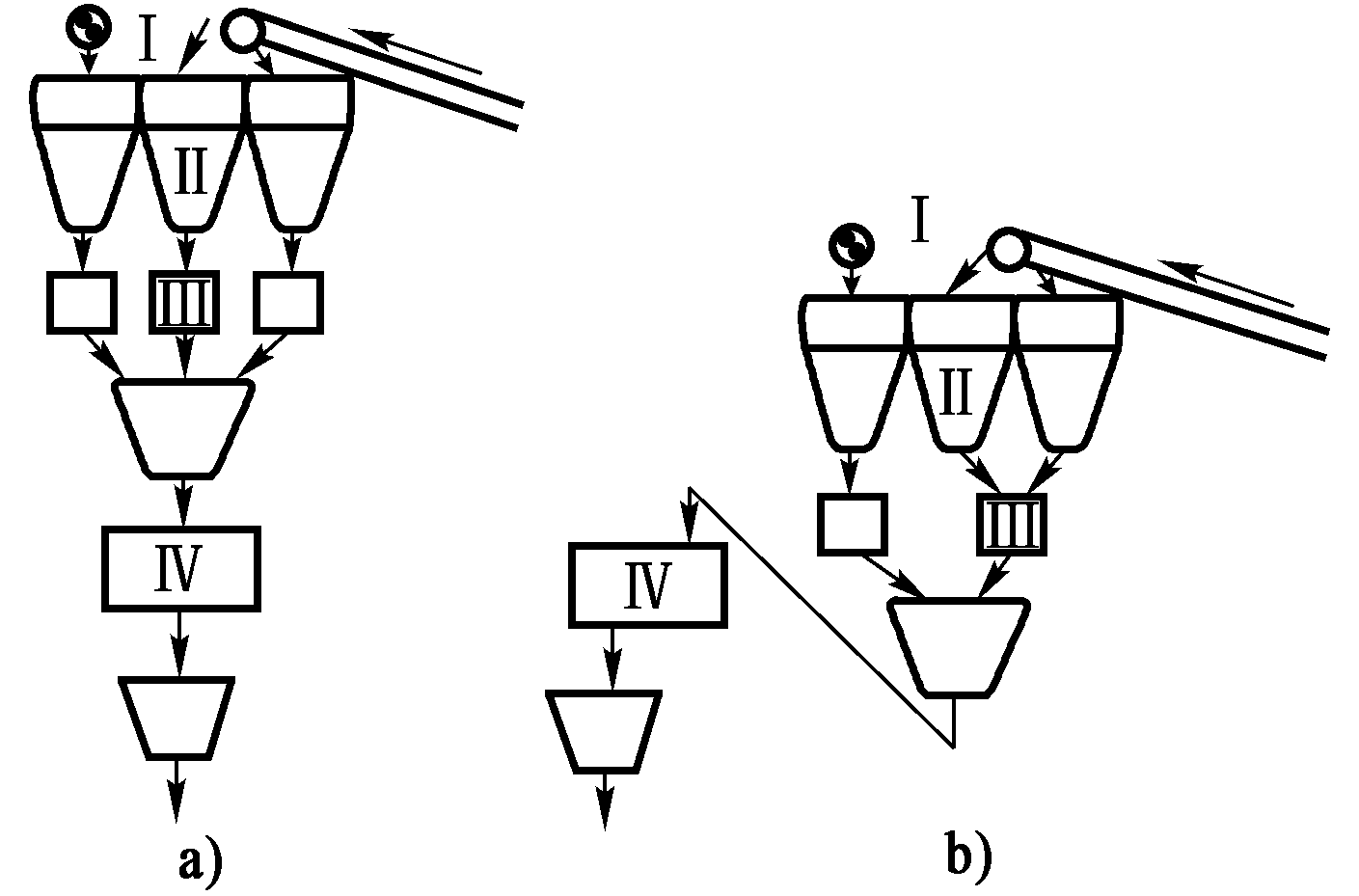I 運輸設備;II 料斗設備;III 稱量設備;IV 攪拌設備
