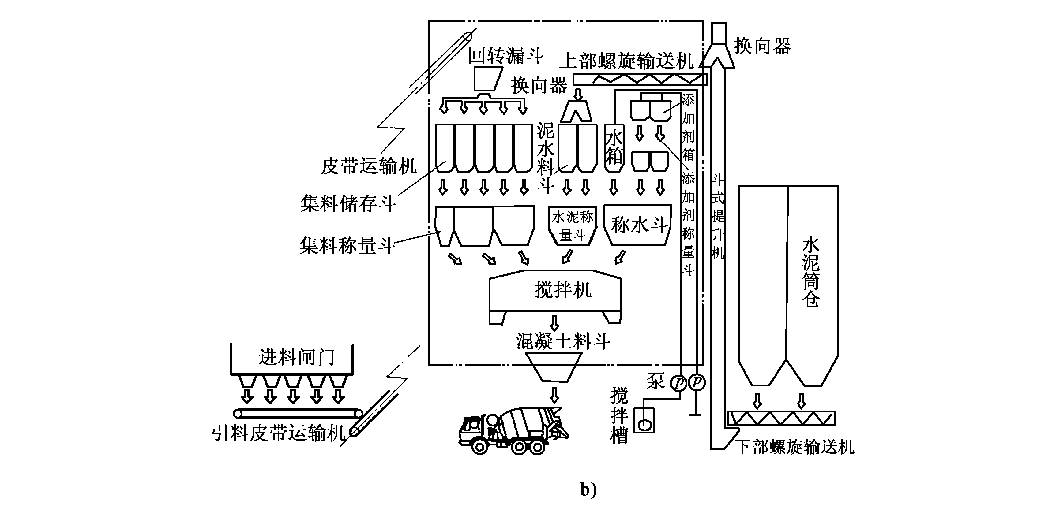 a.混凝土攪拌站結構圖;b.工藝流程圖