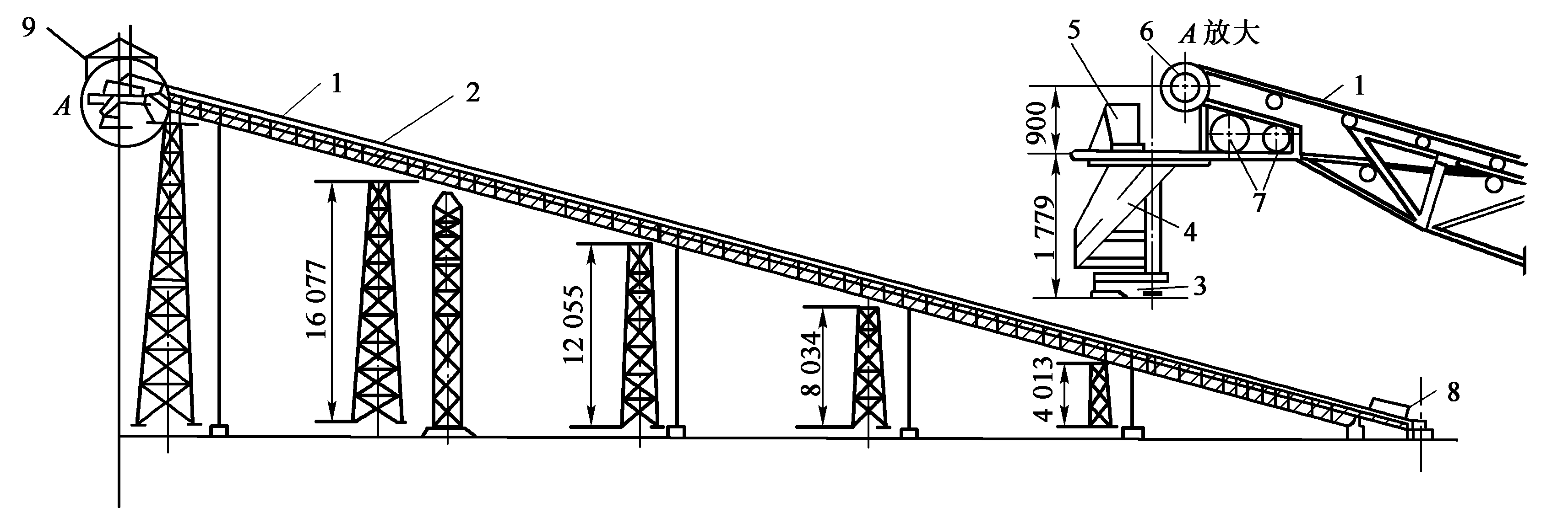 1運輸帶;2型鋼支架;3回轉進料斗傳動裝置;4回轉分料斗;5擋板;6卸料滾筒;7驅動滾筒;8加料斗;9機房