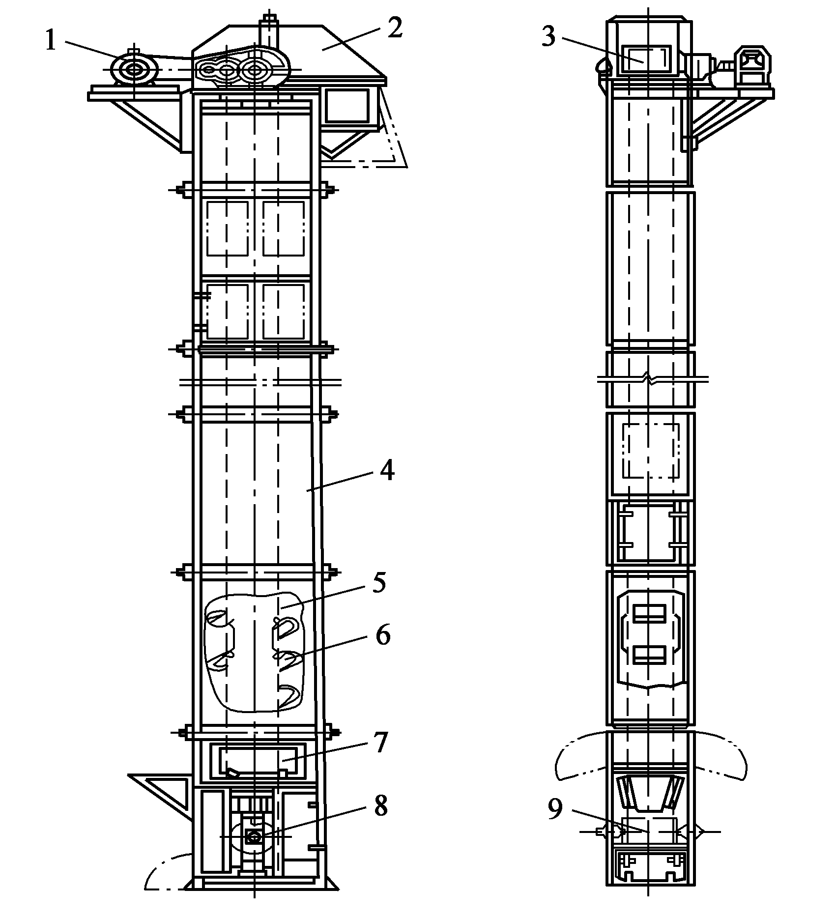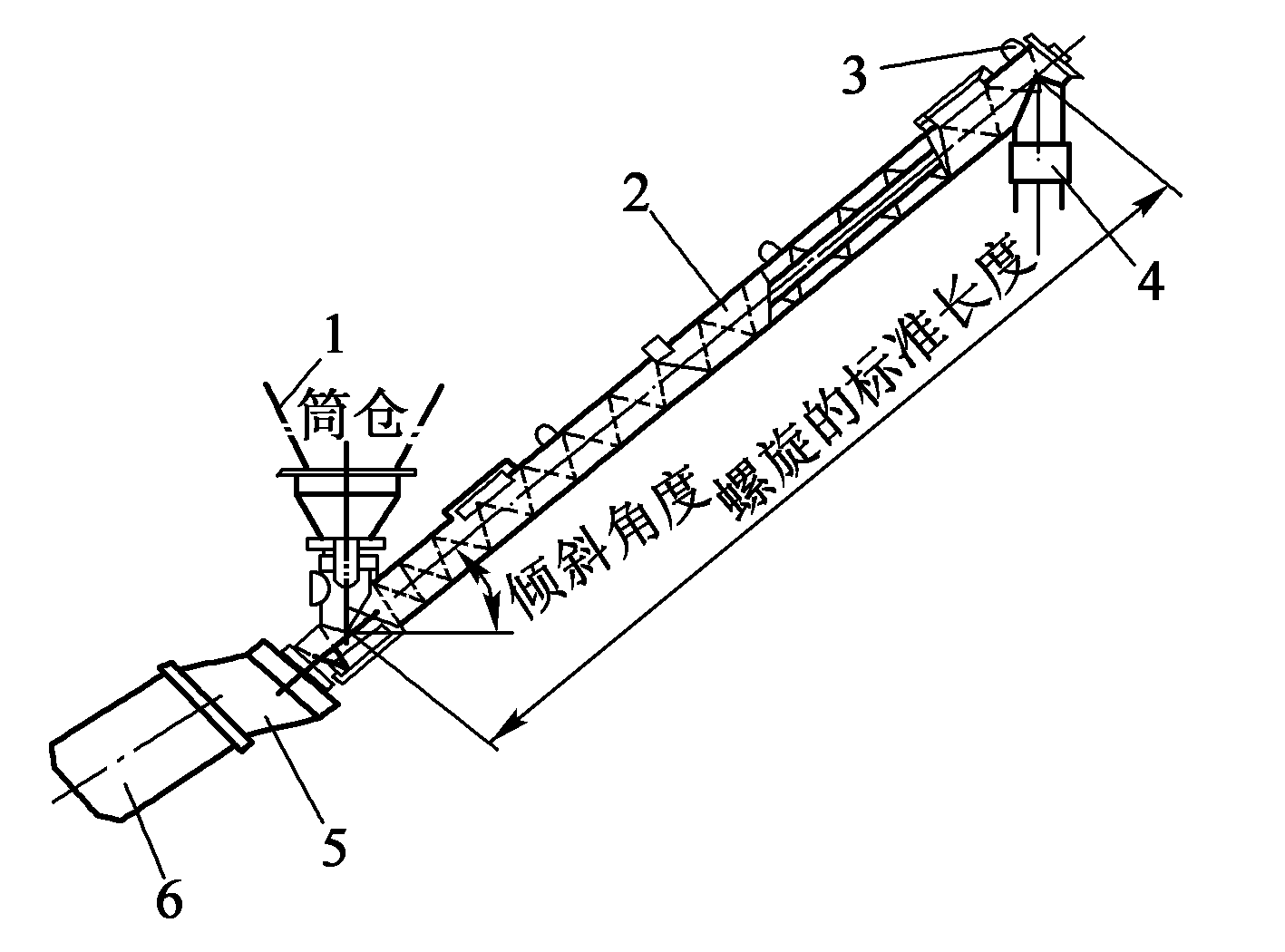 1.筒倉;2.螺旋葉片;3.懸索;4.套管;5.減速器;6.電動機