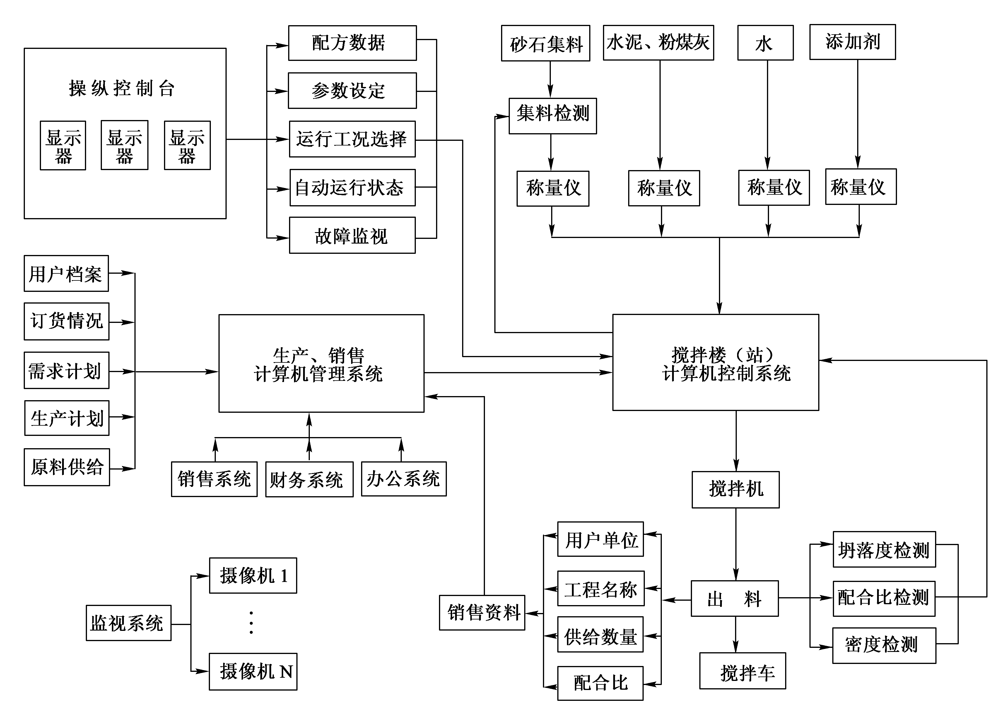 混凝土攪拌樓(站)采用計算機控制系統,實現了對配合料的儲存、供應、計量、攪拌和卸料等生產工藝過程的自動控制。控制系統包括硬件系統(如可編程控制器、計算機等)和軟件系統(如管理程序和可編程控制器控制程序等)。