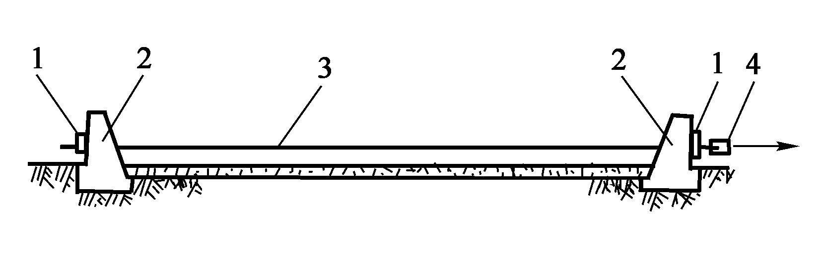 先張法為先張拉鋼筋,后澆筑混凝土。施工過程為:張拉機(jī)械4張拉鋼筋3后,用夾具1將其固定在臺(tái)座2上,澆筑混凝土,混凝土具有一定強(qiáng)度后,放松鋼筋,鋼筋回縮,使混凝土產(chǎn)生預(yù)應(yīng)力。