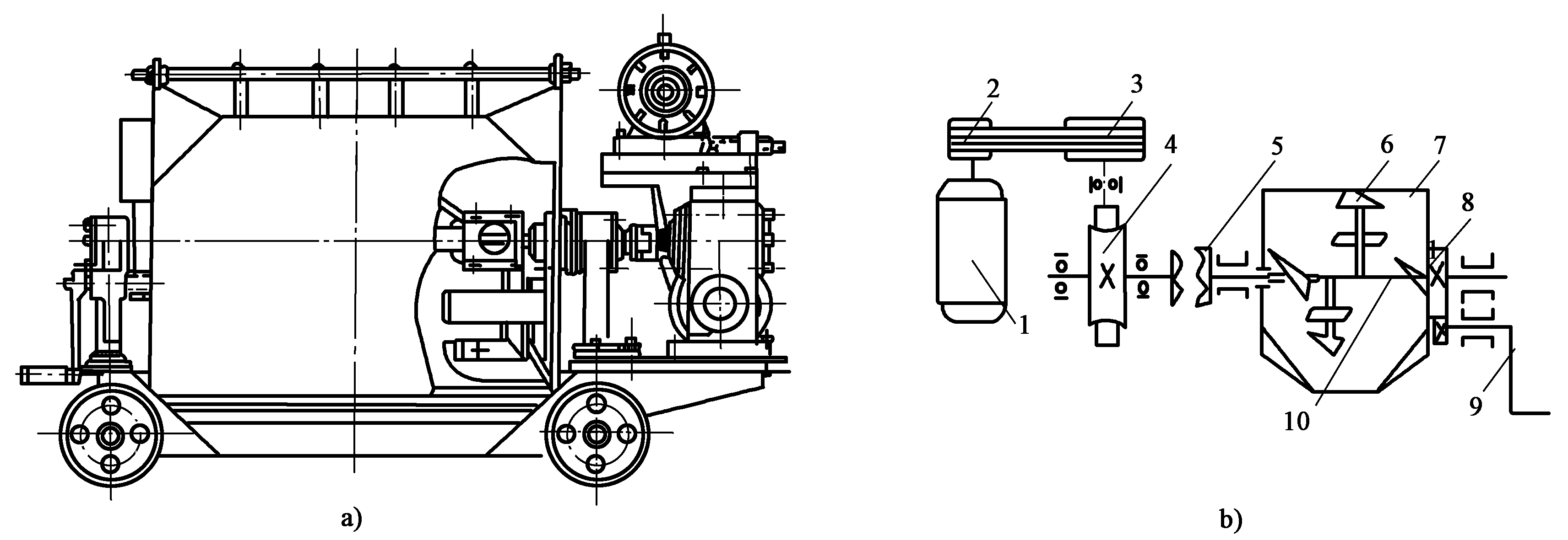氣動式灰漿泵利用壓縮空氣壓送灰漿。它的主體是一個臥式壓力缸1,頂部裝有壓蓋3。缸內裝有一根帶攪拌葉片的水平攪拌軸6,由電動機或柴油機經減速器驅動。這種泵通常配有空壓機、液壓加料斗、拉鏟、行走裝置等。灰漿可由自身的攪拌裝置制備,也可將制備好的灰漿直接裝入缸內,然后將蓋壓緊,接通壓縮空氣將其送入密閉的壓力缸內,使用時打開出料口,即可將灰漿壓出。該機用途廣泛,除了用作灰漿輸送泵和灰漿攪拌機外,還可以用來攪拌和輸送細石混凝土或干料。(圖6-6)