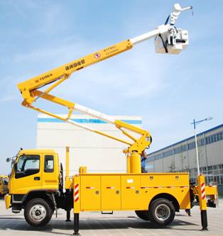 高空作業車采用定型生產的汽車底盤作為行走機構,實現行走(轉場)和運載功能。除汽車底盤外,為實現高空作業功能,高空作業車的構成還包括動力系統、工作機構、機械結構、液壓和電氣控制系統以及安全裝置幾部分。